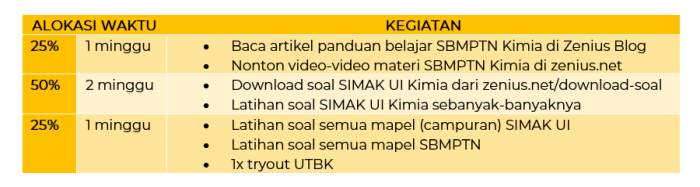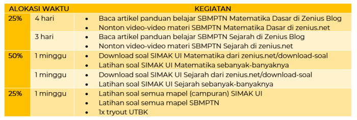 Di sisi lain, kalau lo punya nilai UTBK yang bagusnya/jeleknya merata dan ada lebih dari 1 mapel yang mau lo tingkatkan nilainya, lo tetap bisa pakai strategi gue di atas kok. Tinggal lo bagi lagi alokasi per kegiatan jadi per pelajaran. Gue kasih ilustrasi lagi deh ya.