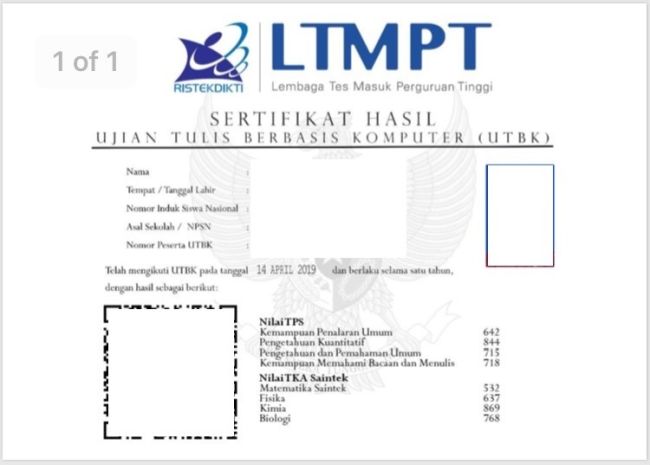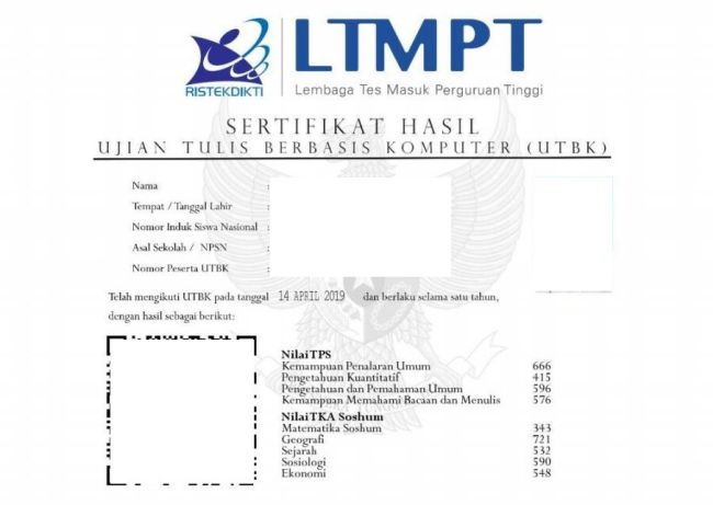Oke, coba kita lihat dulu contoh rapor nilai UTBK yang dikeluarkan LTMPT.